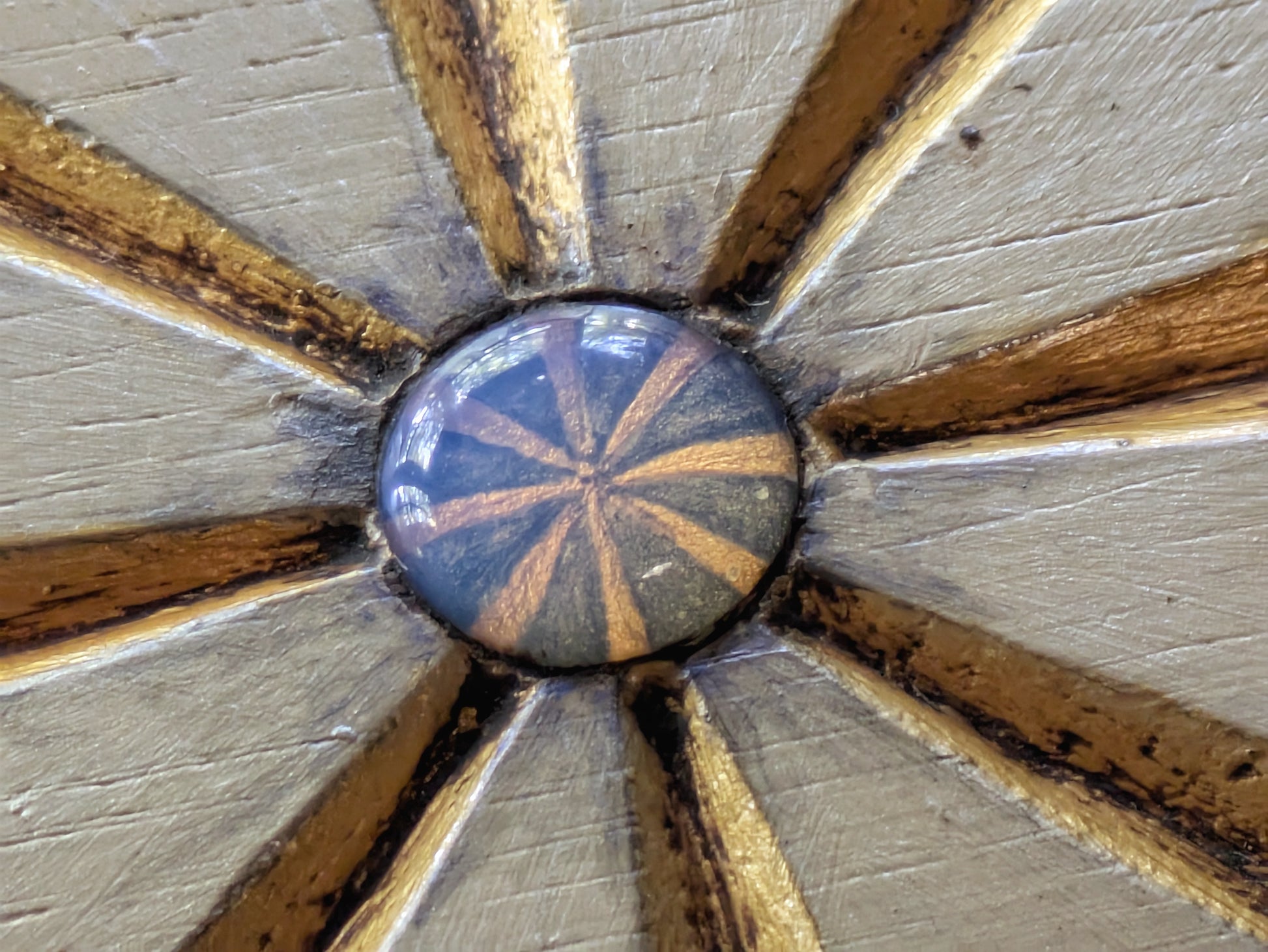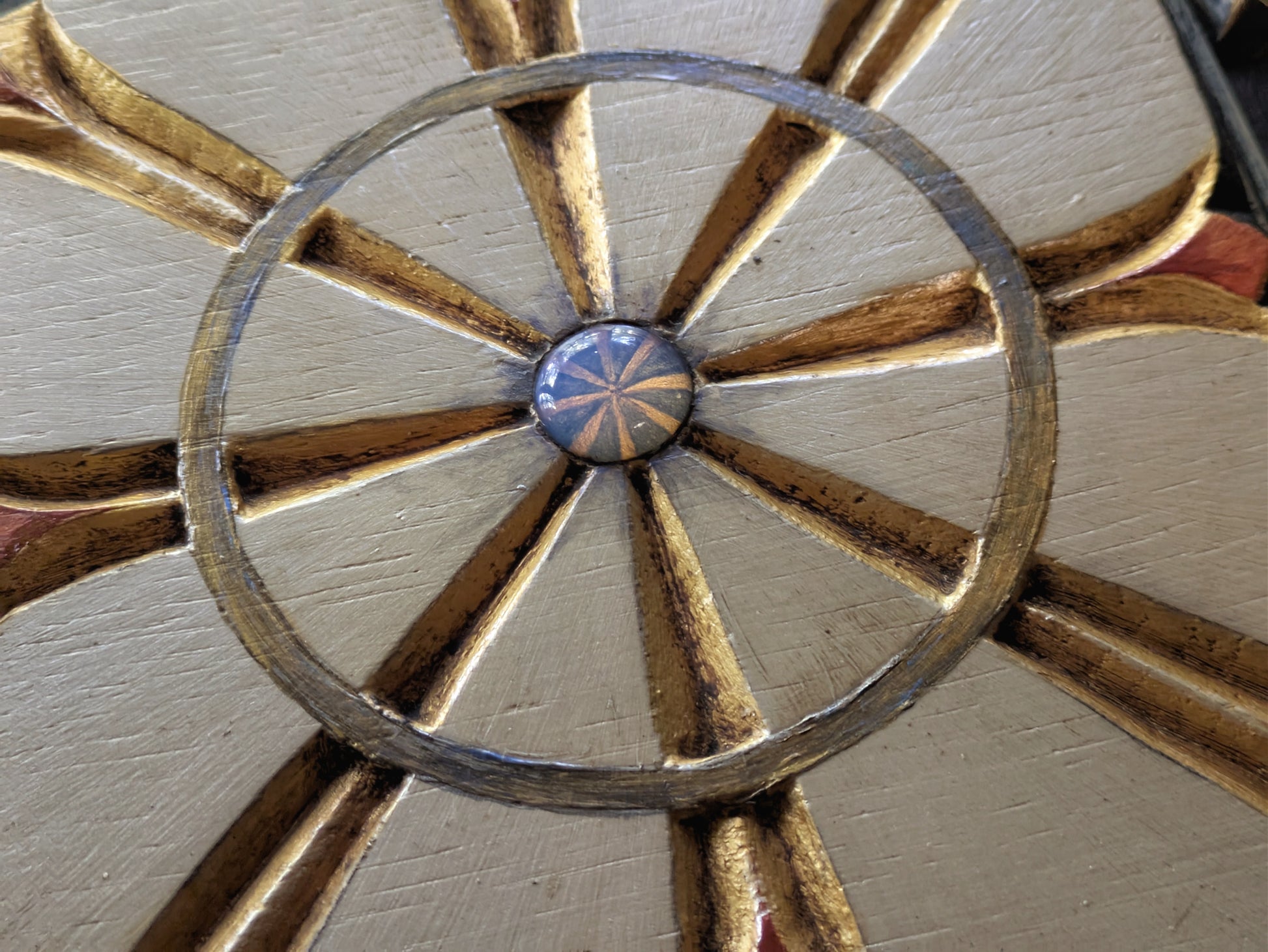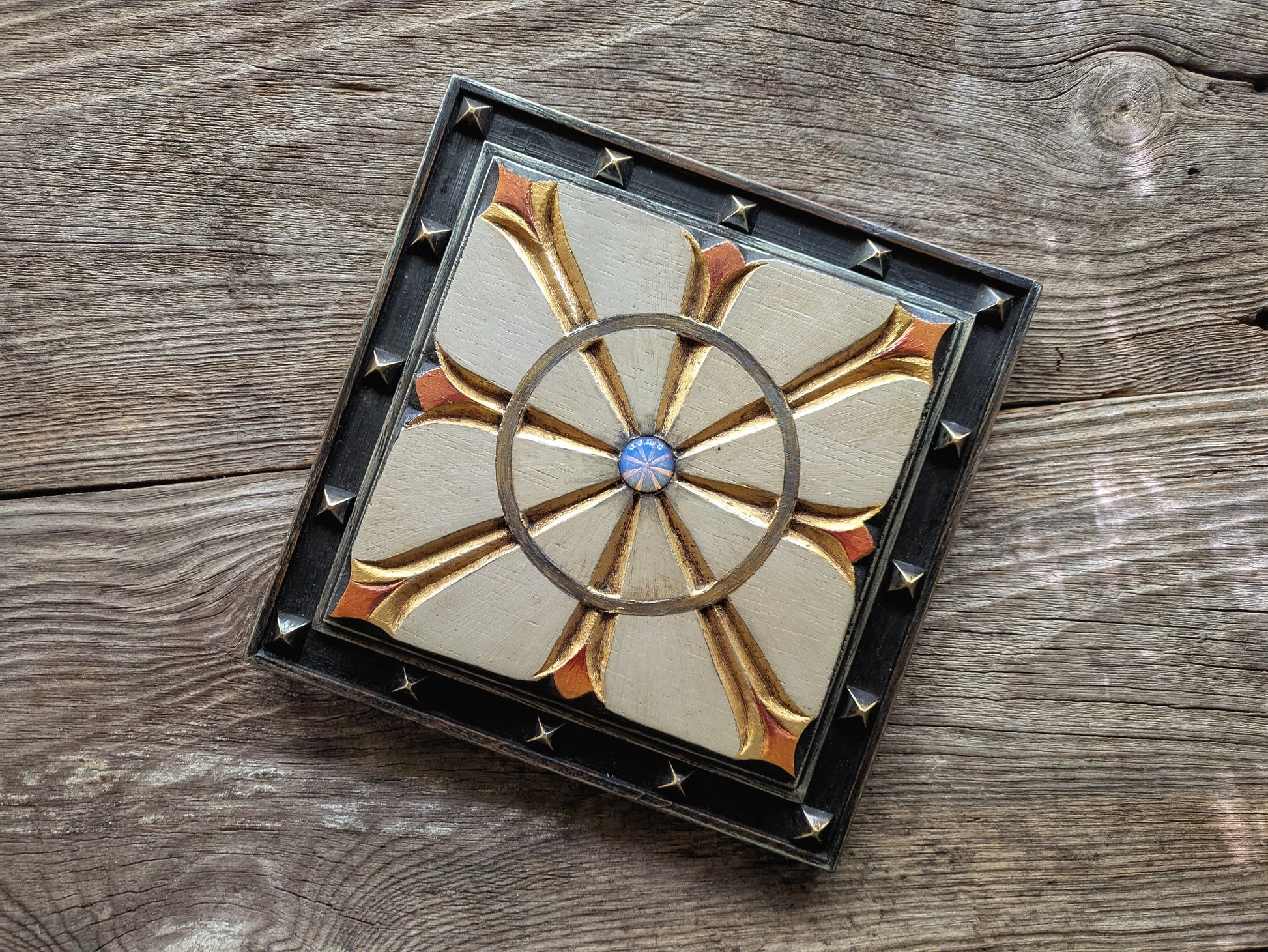 I wanted to preserve the distinctive grain of the wood under the primer, so I chose a slightly more "impressionist" style for the paint to match the more rugged surface. And I added some subtle blue touches to the sunny colour scheme to accommodate the bluish tone of the opalite.