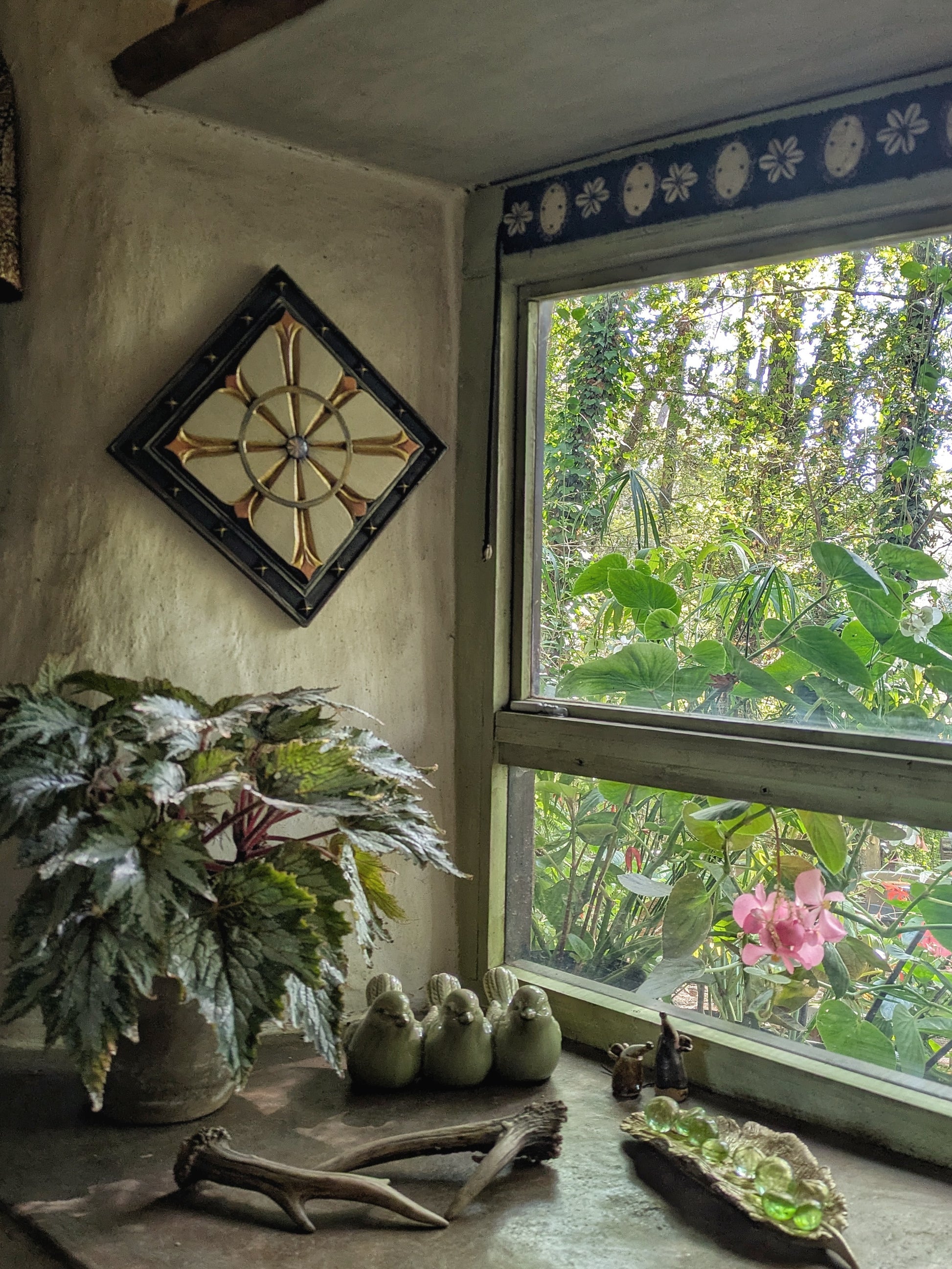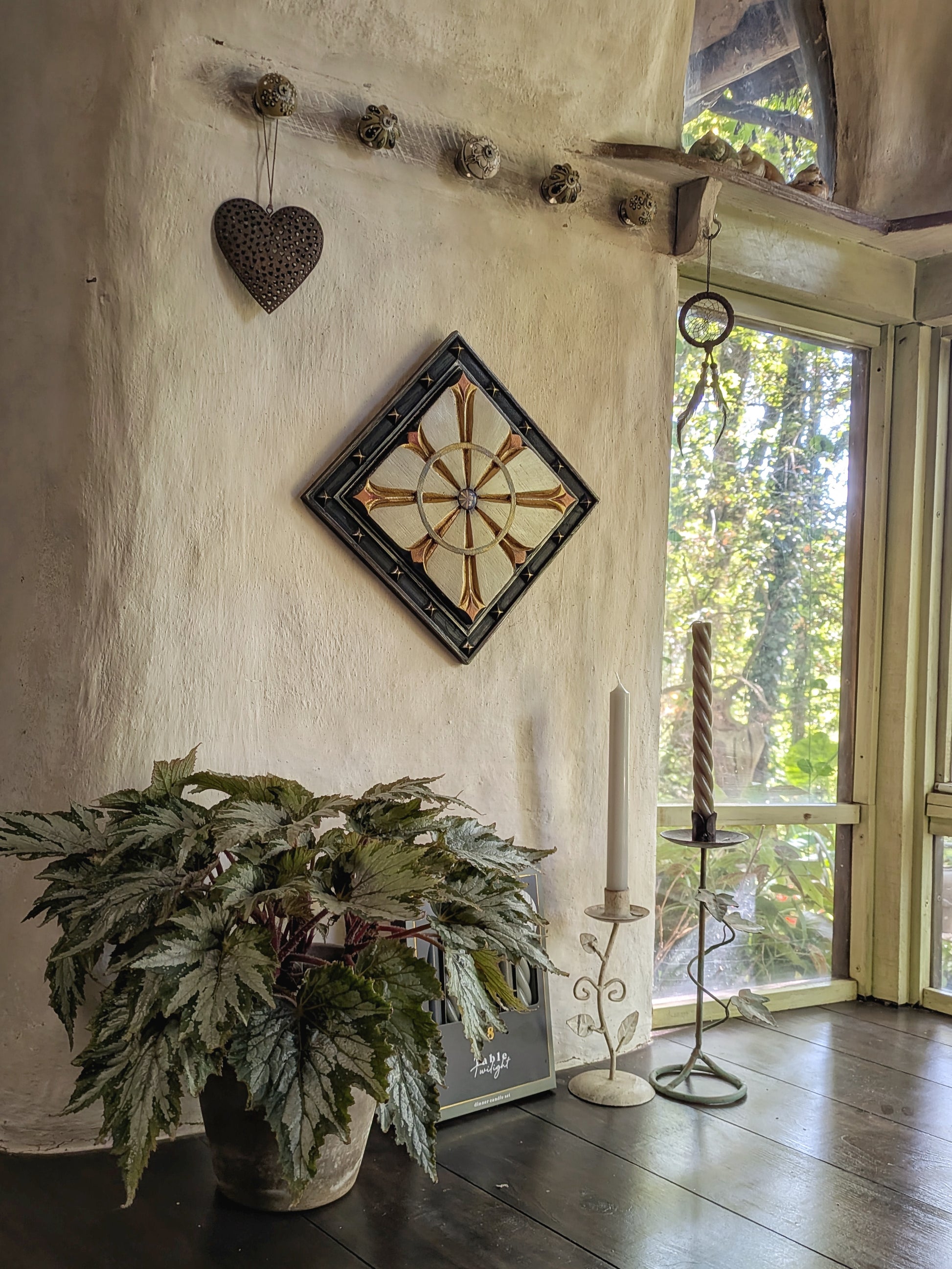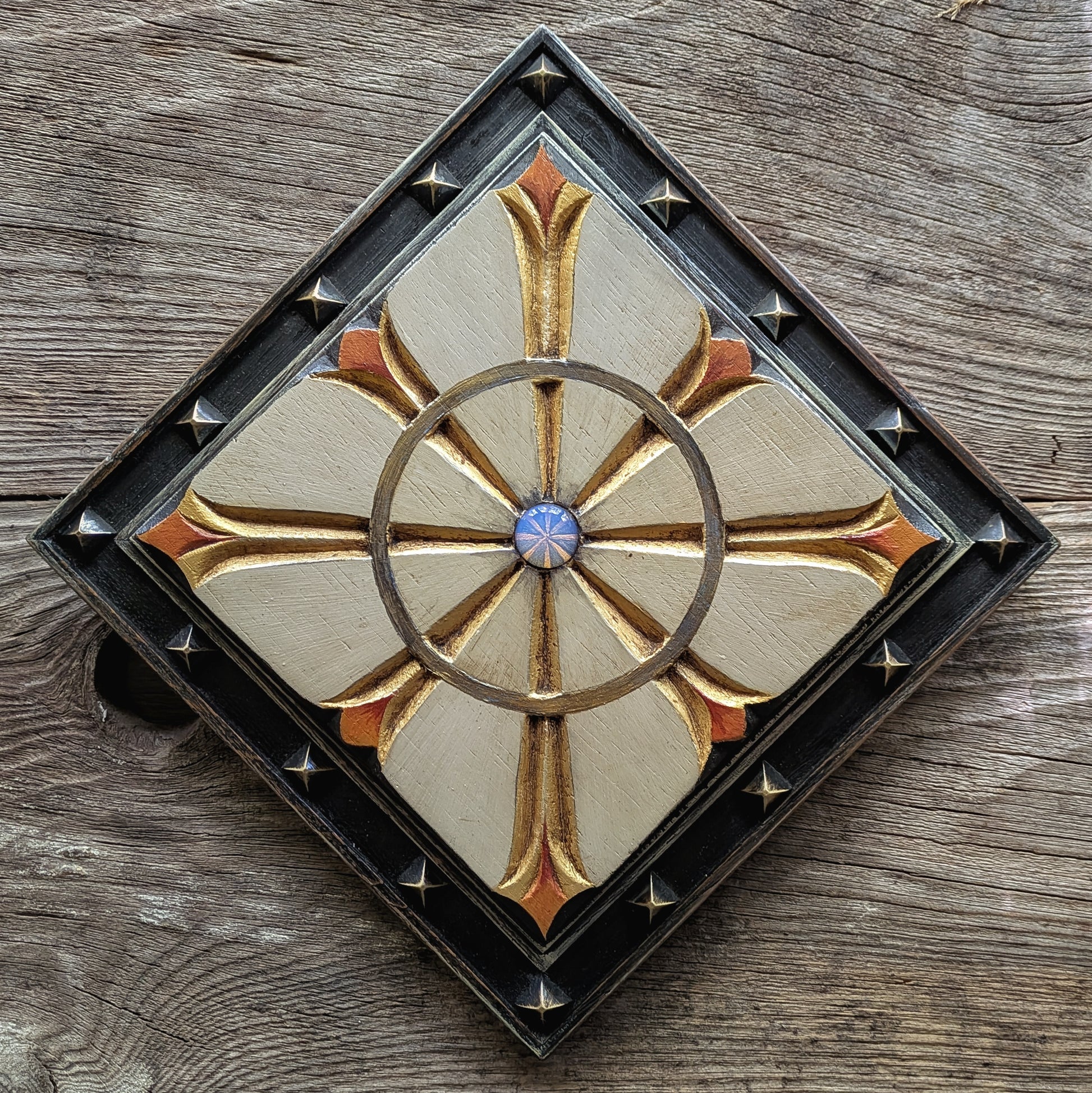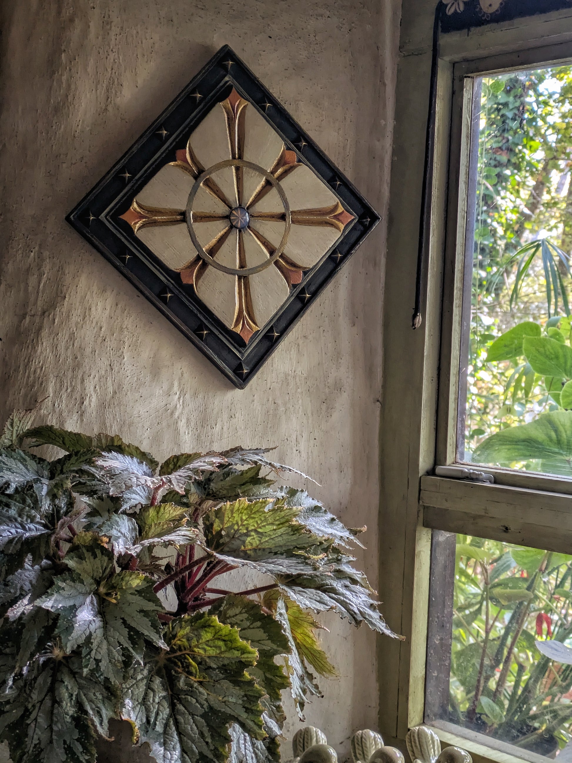 I wanted to preserve the distinctive grain of the wood under the primer, so I chose a slightly more "impressionist" style for the paint to match the more rugged surface. And I added some subtle blue touches to the sunny colour scheme to accommodate the bluish tone of the opalite.