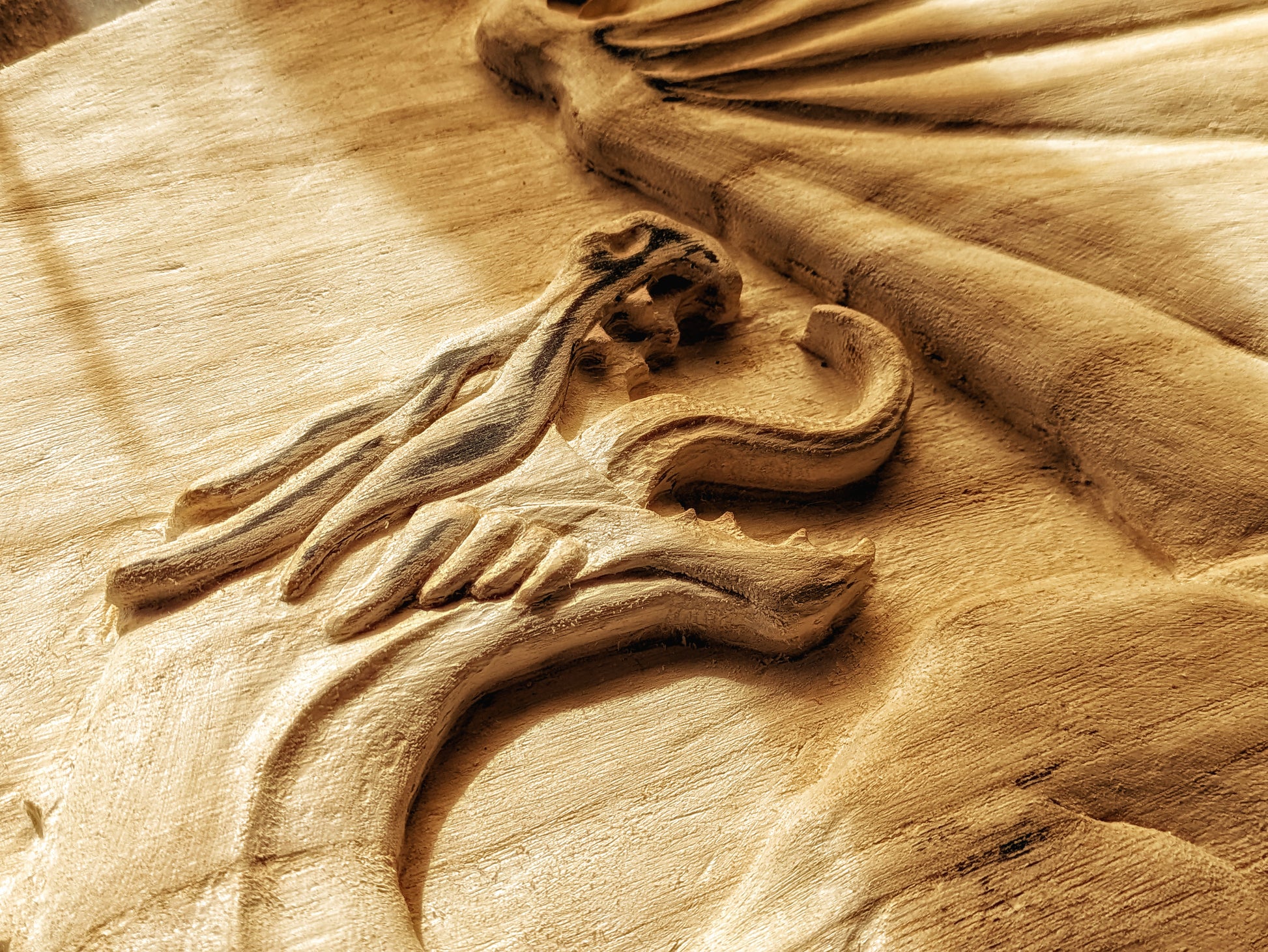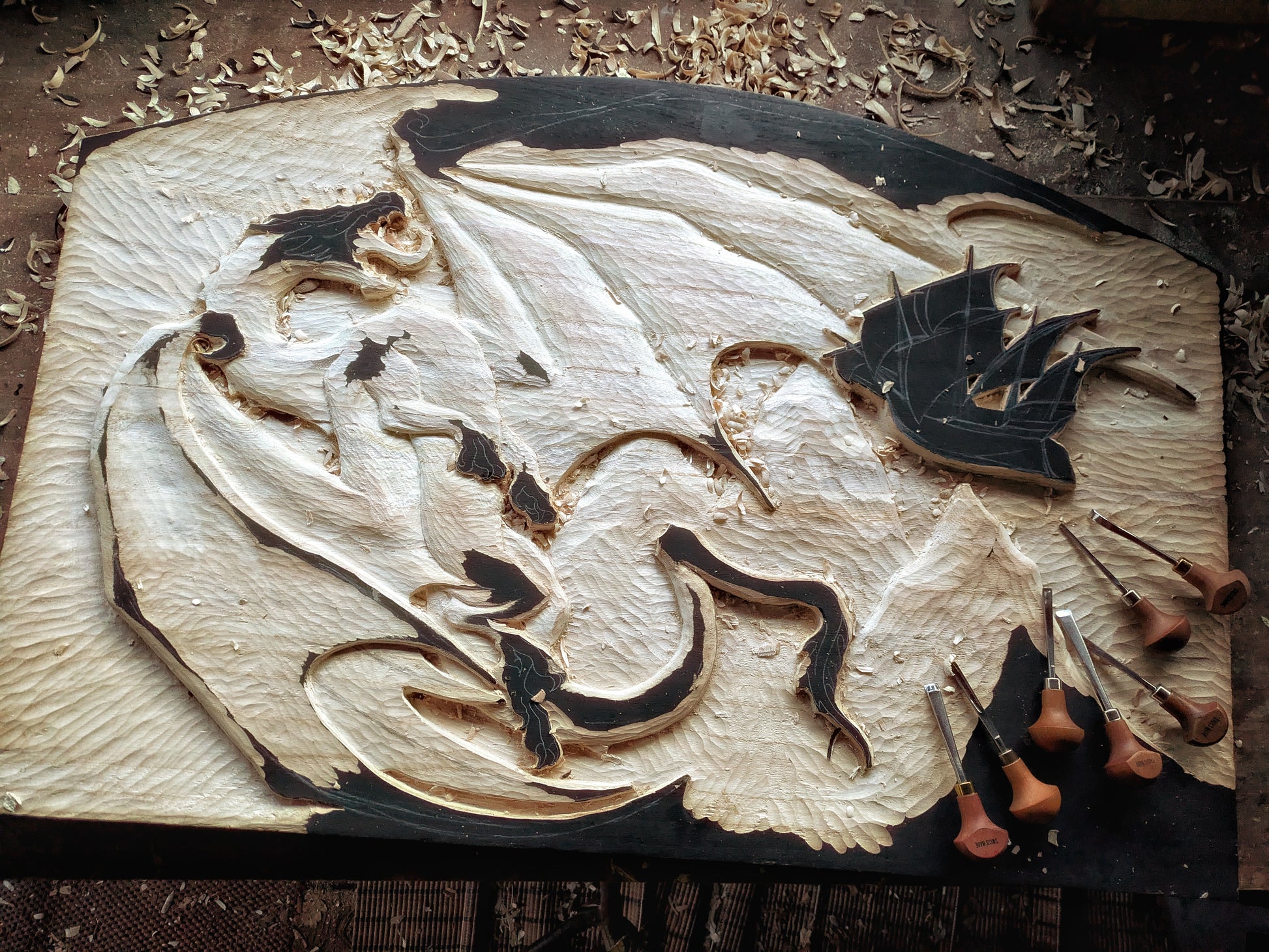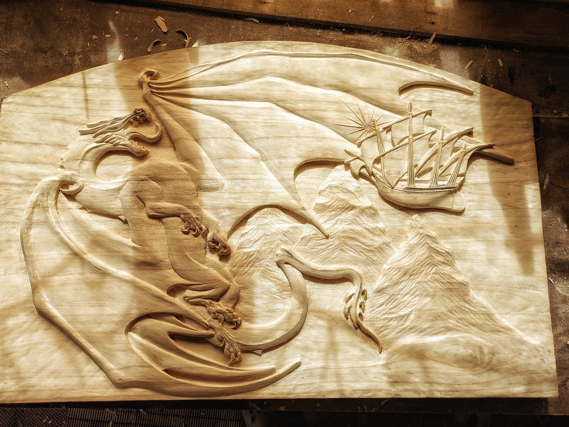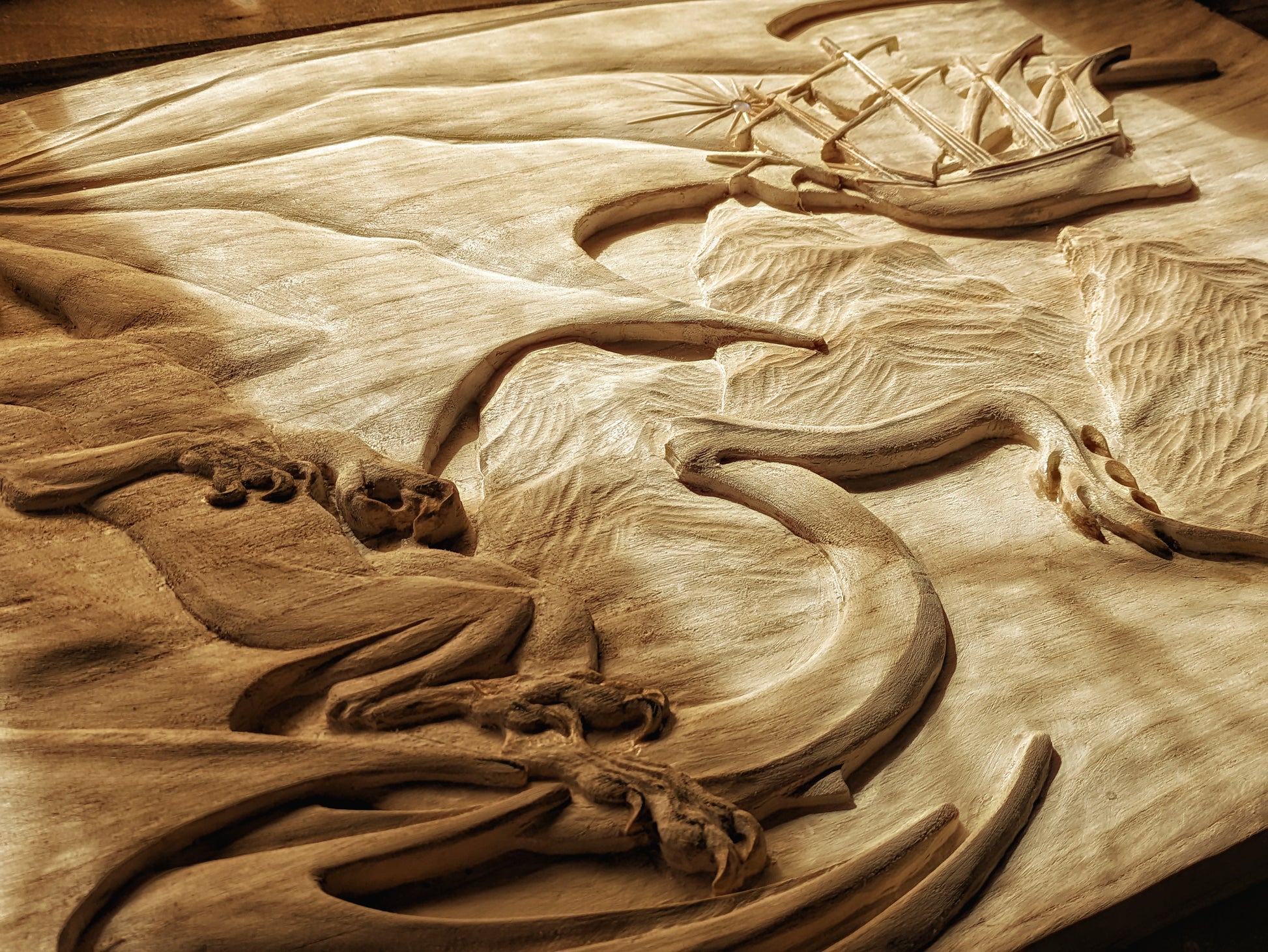 The most ambitious Fauno project to date, the Fall of Ancalagon is a 90x60 cm carving representing the epic battle between the greatest dragon ever seen in Middle-earth and the hero Eärendil on his astral ship Vingilot. This scene is briefly described in the Silmarillion.
