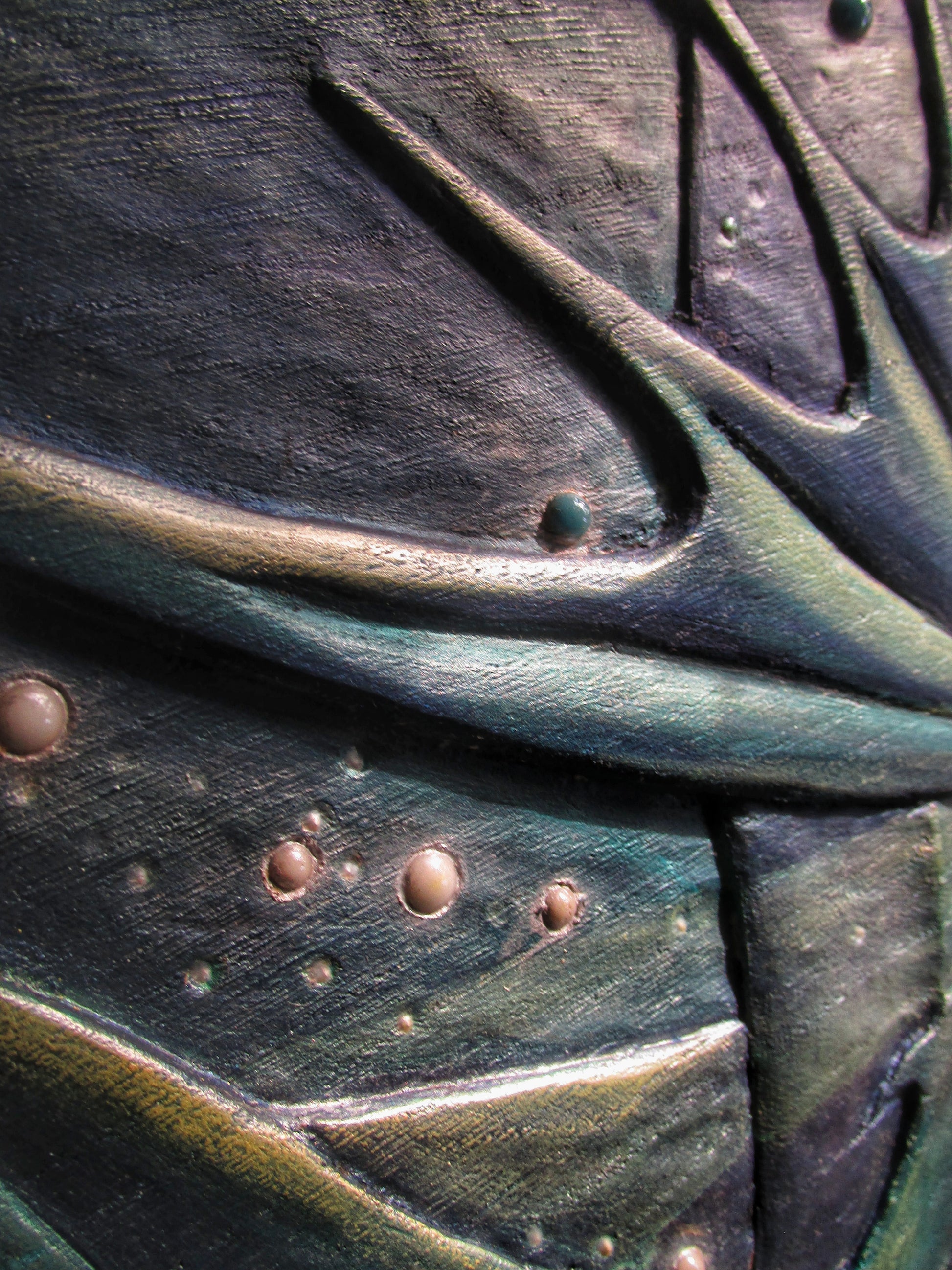 Entirely hand carved from an upcycled plank with exquisite grain, painted with plain and metallic acrylics for that special depth of colour, and finished with carnauba and metallic wax.